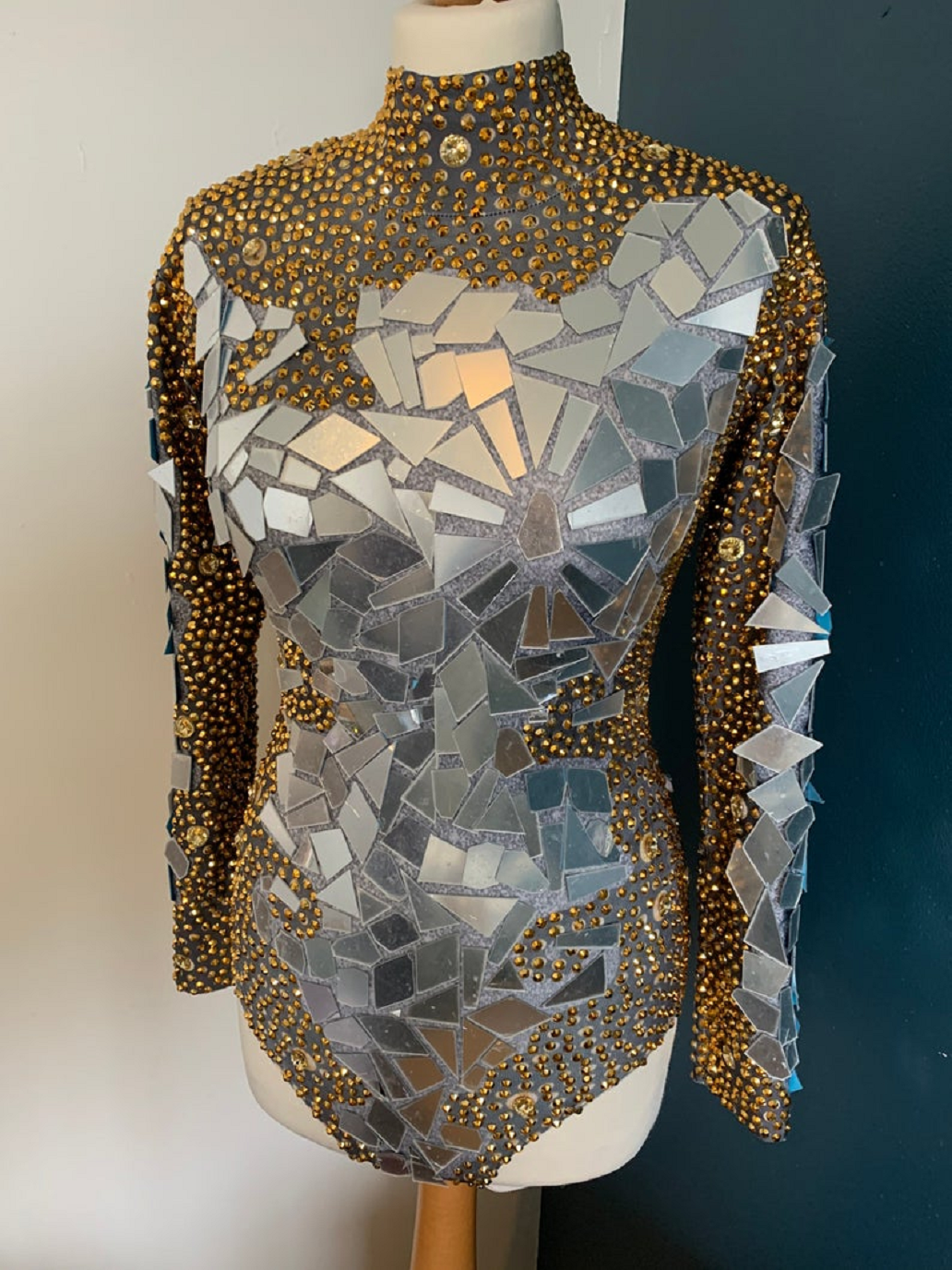 8. Mirror & Gold Crystal Stud Bodysuit with Long Sleeves for Performers.