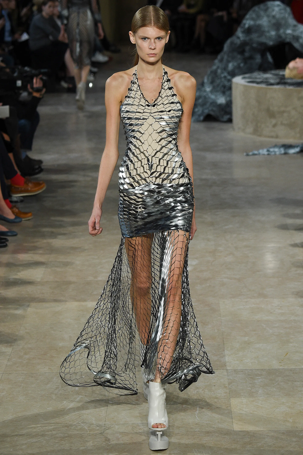9. Silver Dress with Tiny Mirror Tiles Ornaments on Transparent Fabric with Long Sleeves and Deep V-Neckline.