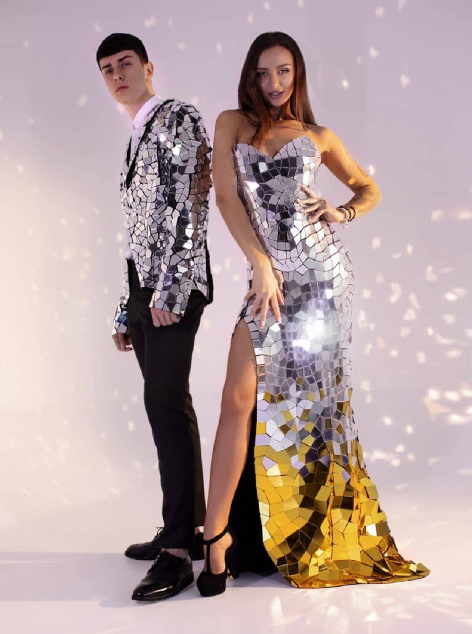 21. Silver Mirror Jacket and an Ombre Style Sleeveless Mirror Disco Ball Gown.